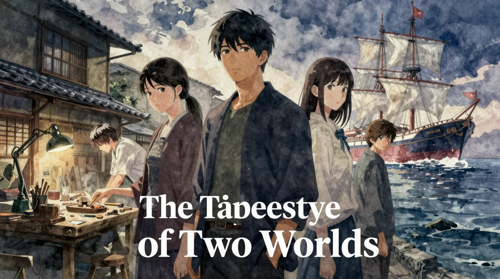 A weathered Korean vessel crossing the East Sea, its wooden hull creaking with every swell. The cramped cargo hold smells of salt, dried fish, and paper. Min-ji and So-young share quarters with bales of silk and crates of ceramics, sleeping on thin mats while waves rock them between worlds.