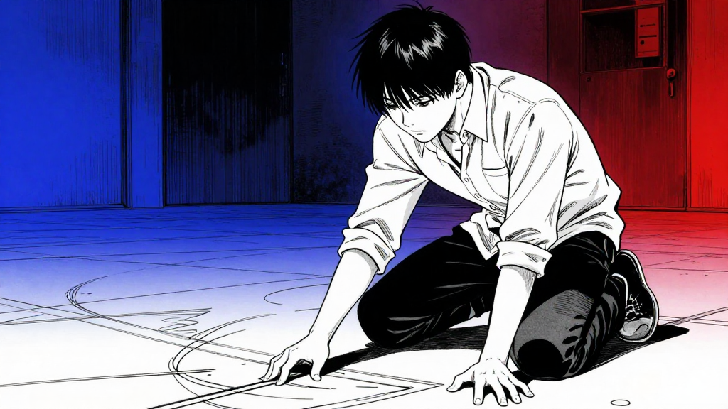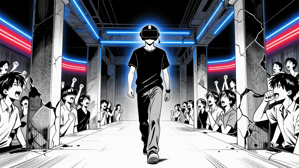 Neon-lit Ludus VR Arena, cracked pillars, crowd roaring. Cassian walks forward, calm.