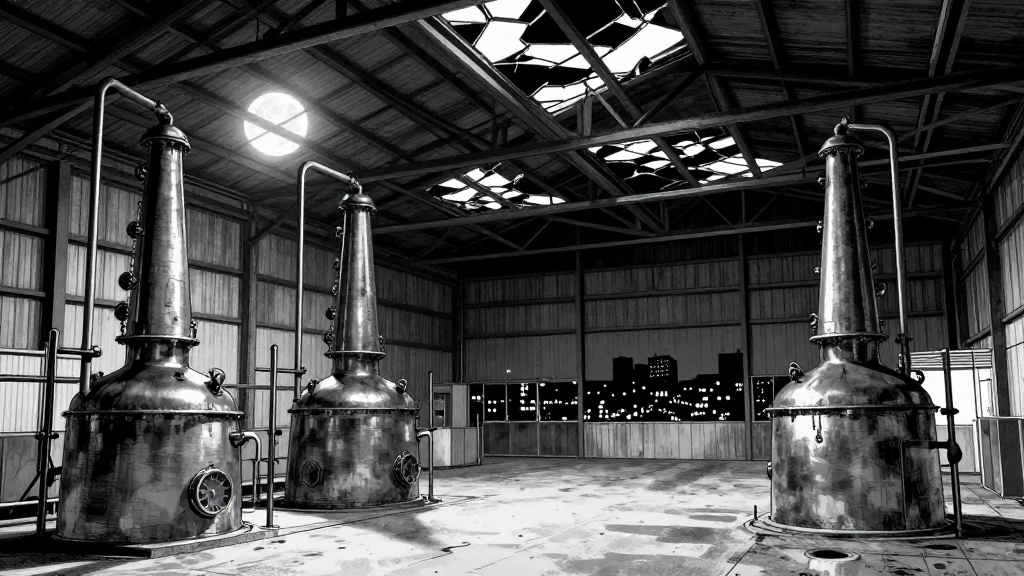 Wide shot of the warehouse, moonlight through broken skylights, copper stills gleaming, distant city lights.