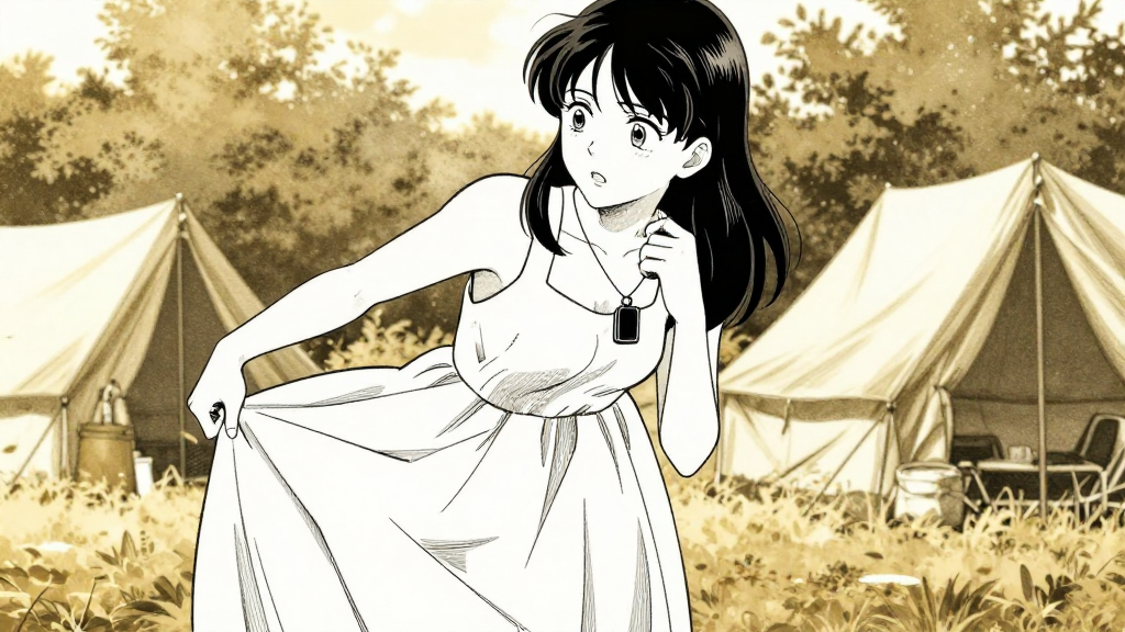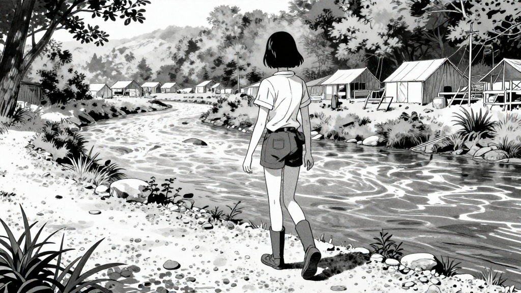 Martha steps onto the gravel bar, river swirling behind her. Mining camp stretches in the distance.