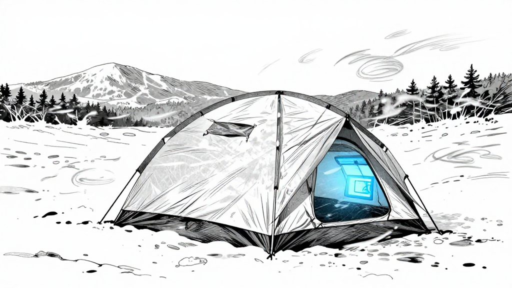The Base Camp Research Tent, lit by cold blue monitors. Wind whips snow into spirals outside.