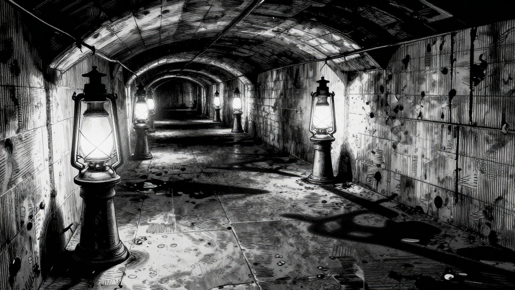Gas lamps flicker in the River Fleet Sewers, shadows shifting in the damp air.
