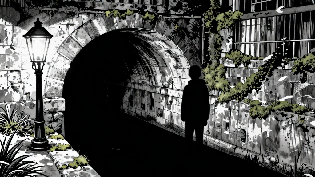 Wide shot of the River Fleet sewers, gas lamp flickering, moss-covered arches, Silas’s shadow stretching into darkness.