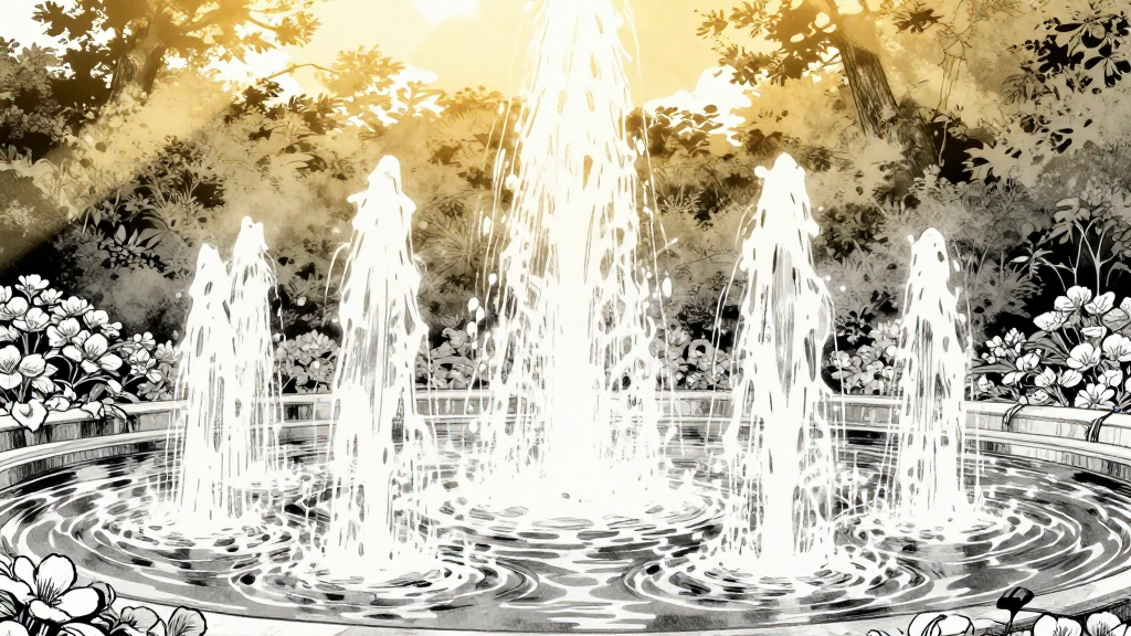 Golden light bathes the Garden of Eternal Bloom, water flows upward in crystalline fountains.