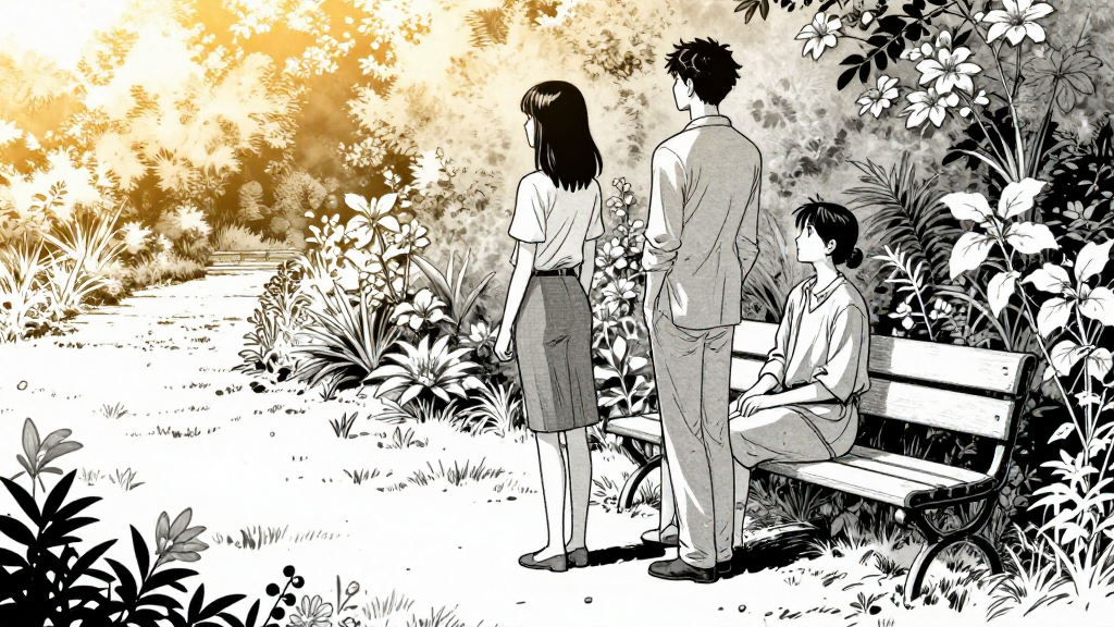 Elena stands in the Garden of Eternal Bloom, gazing at Pierre on a bench.