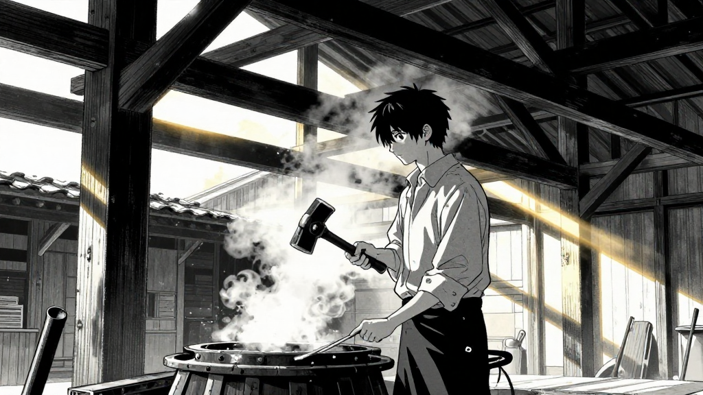 Dawn light filters through the forge's blackened beams, hammer falling, steam rising.