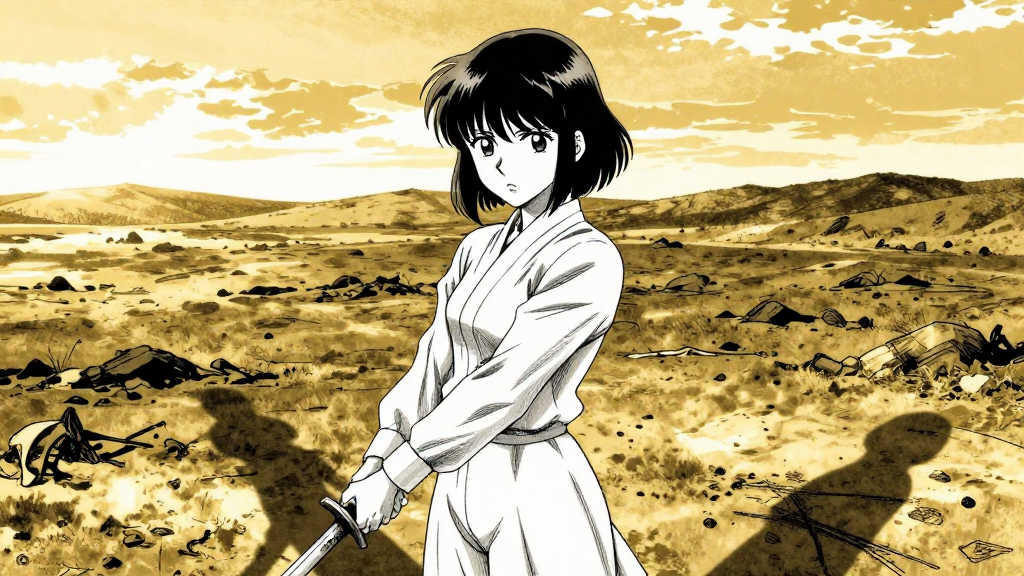 Kaori stands alone on the scorched battlefield, gripping Akari’s hilt tightly.