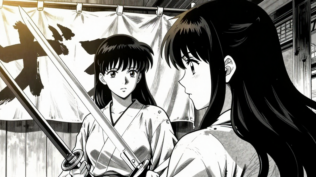 Kaori clutches Akari’s hilt, eyes conflicted, as a flashback inset shows her as a child.