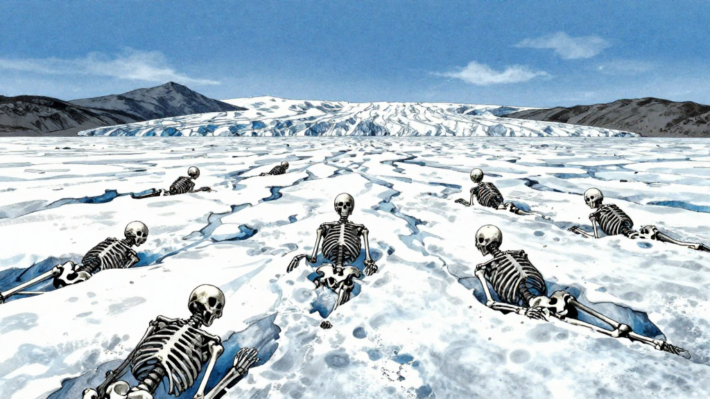 A vast glacial lake surrounded by bleached skeletons emerging from melting ice.