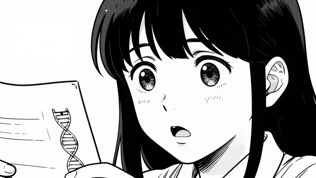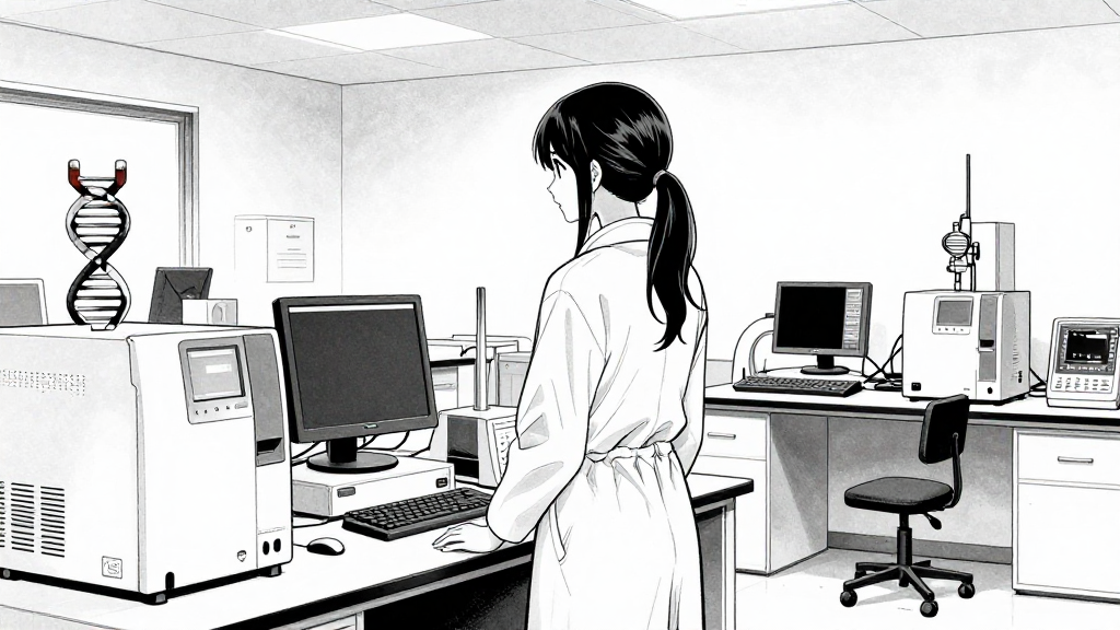 Elena stands in the sterile genetics lab, surrounded by DNA sequencing machines and monitors.