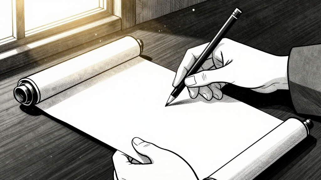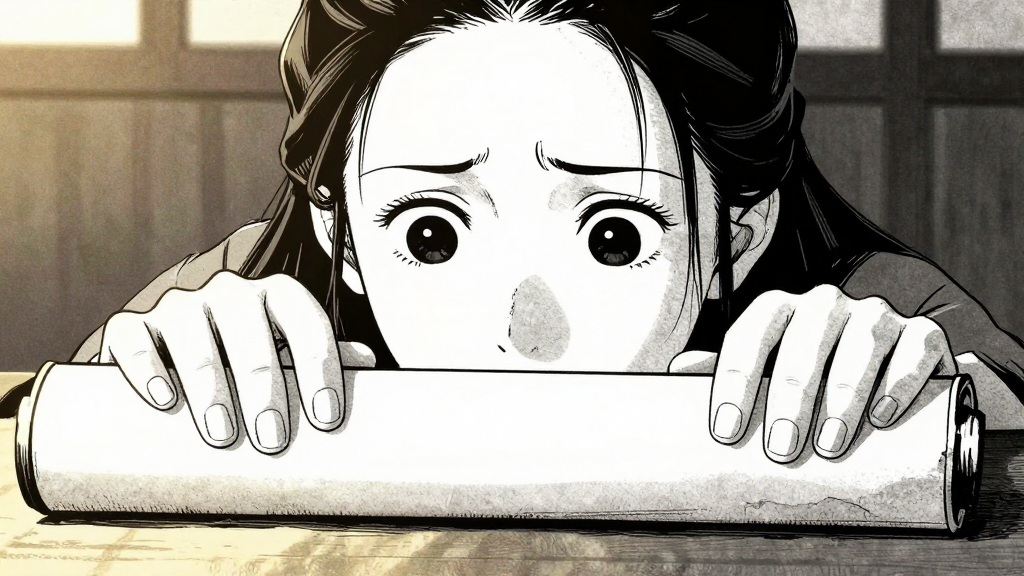 Lin Fei's hands slowly unrolling the scroll, dust motes floating in golden light.