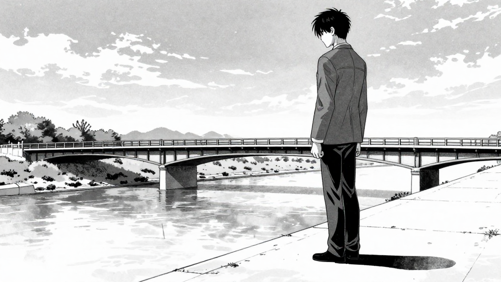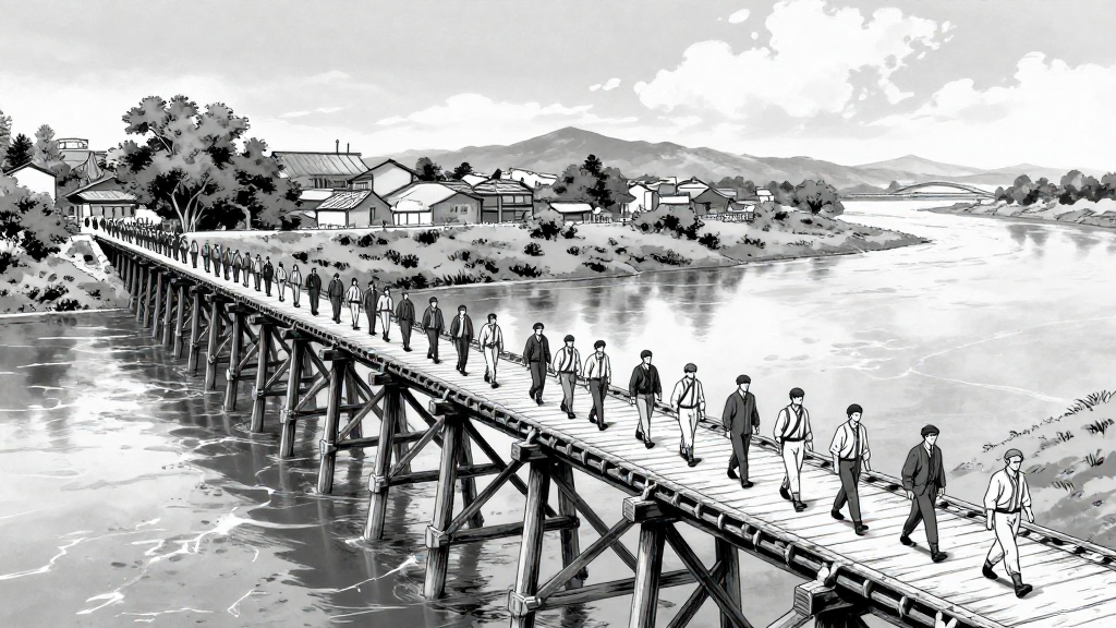 Gray Imjin River flows beneath the wooden Bridge of Freedom. Hundreds of men walk slowly across the creaking planks.