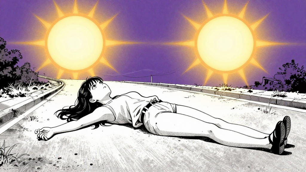 Elena lies on a shifting street, two suns setting in opposite directions.