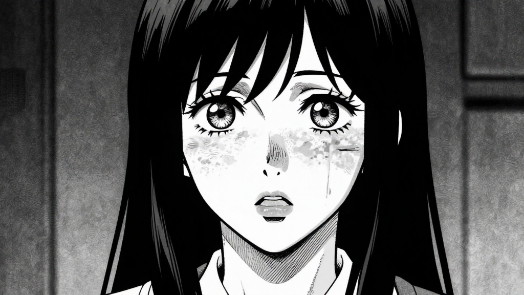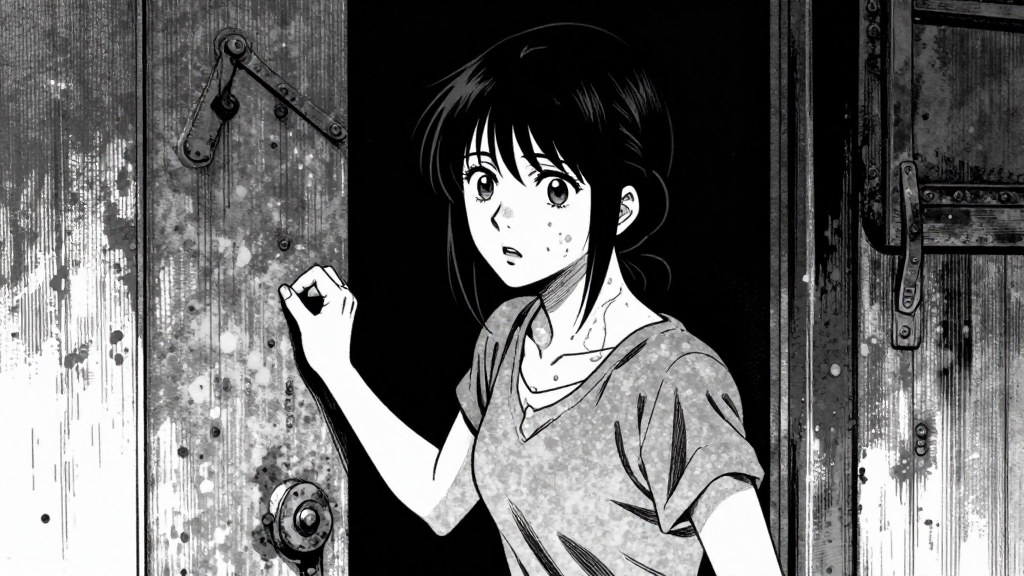 Catherine pounds on a rusted door at midnight. Dim lamplight highlights her bruised neck.