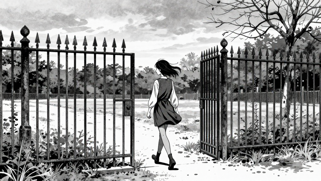 Catherine walks through rusted iron gates of West Ham Park, wind rattling the fence.