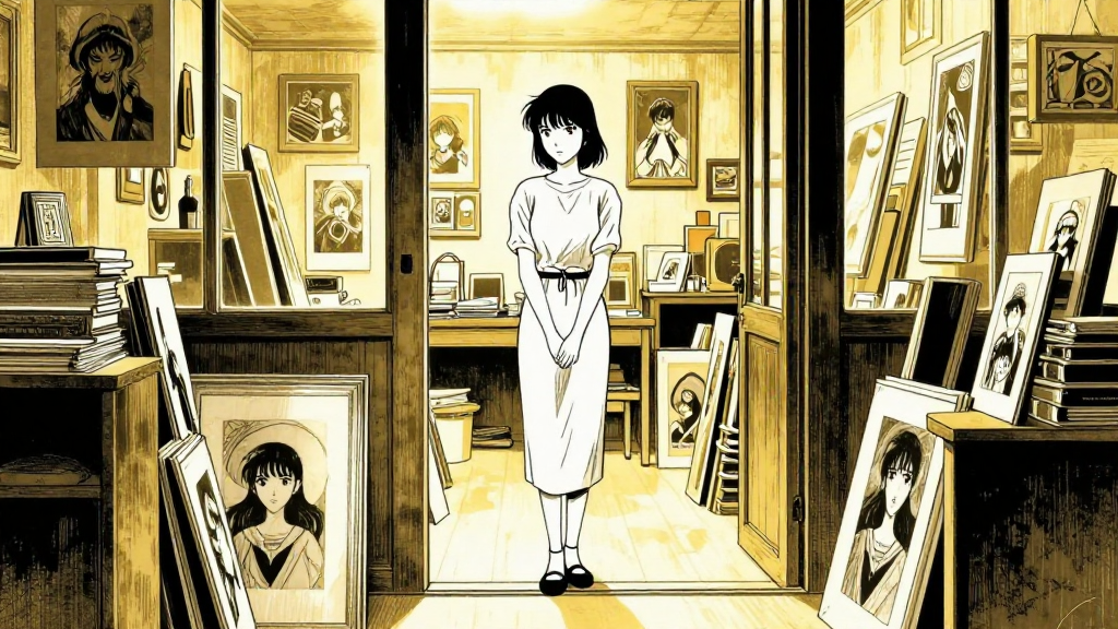 Marie hesitates at the threshold of Foujita's golden-lit studio, filled with art and mystery.