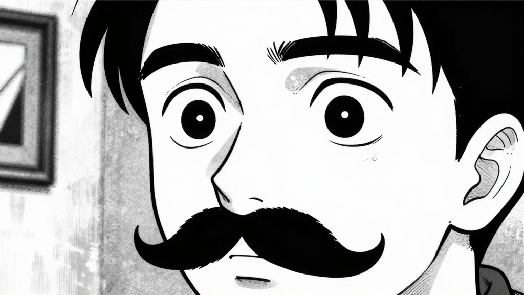 Moustache steps into the canvas, the painting distorting slightly.