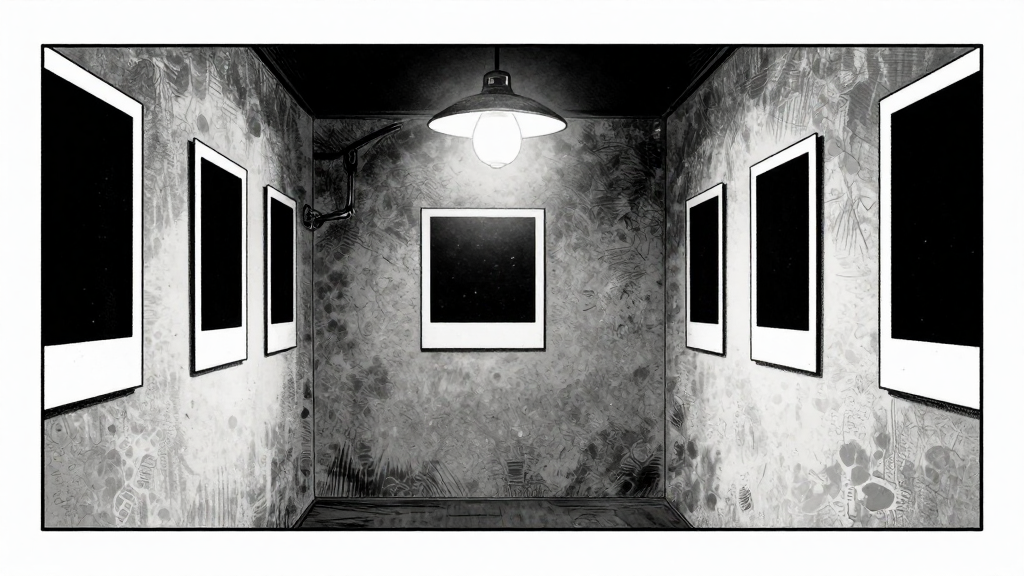 Faded Polaroids line the walls. A single lamp flickers. Dust hangs in the air.