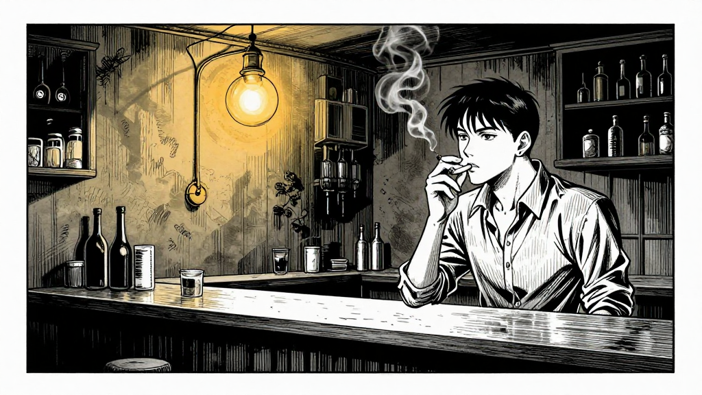 A dimly lit Moscow bar, smoke curling from a cigarette, shadows stretching across the walls.
