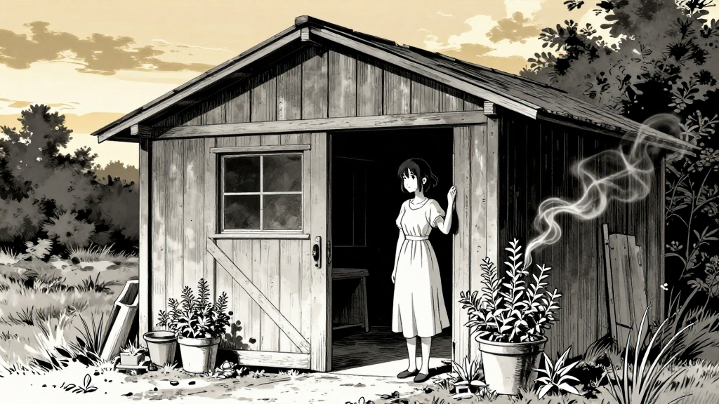 Dusk at Silas's shed, smoke curling from herbs. Clara hesitates at the threshold.