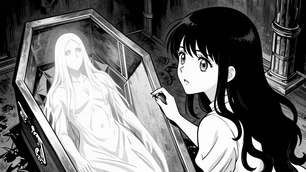 Clara stands before the frozen crypt, breath visible in the cold air. Wind swirls around the iron gate.