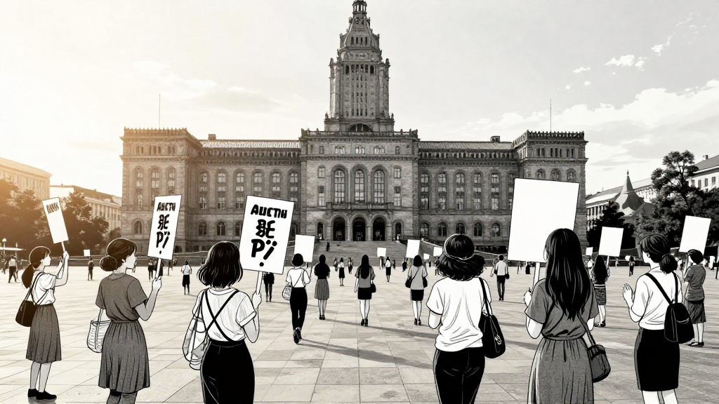 A wide shot of Austurvöllur Square. Women gather, signs in hand. Parliament building looms in the background.