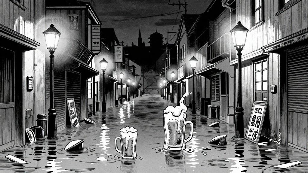 Flooded streets of St. Giles, beer flowing, debris floating, dim gas lamps flickering.