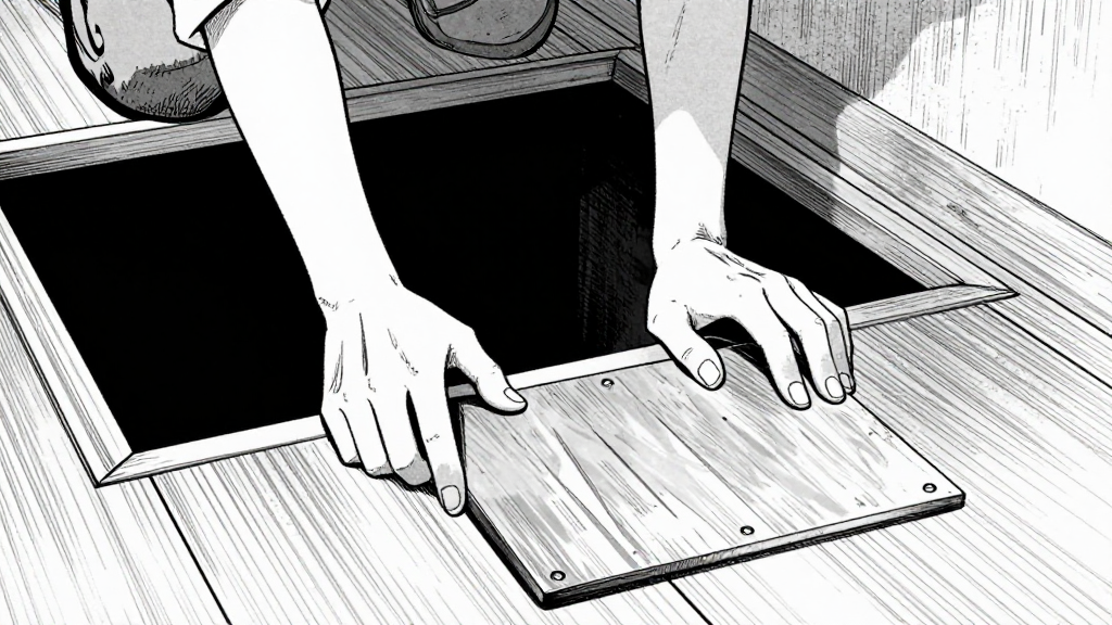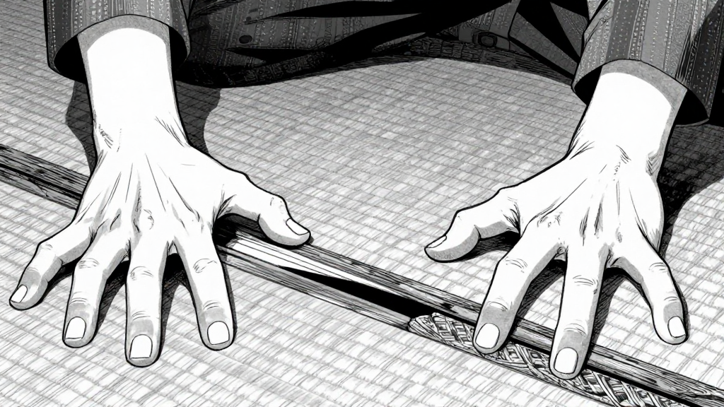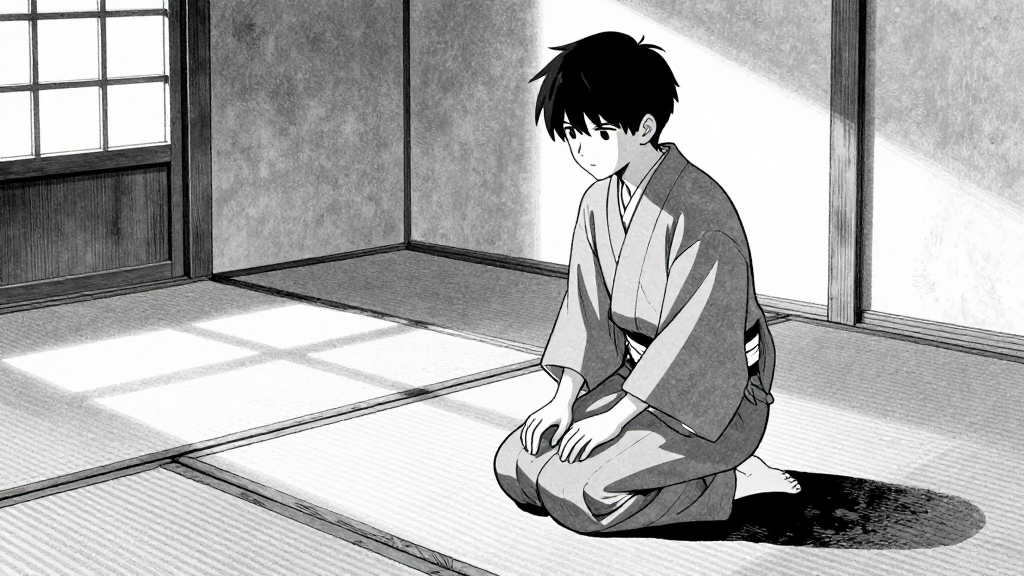 Tetsuya kneels before the tatami mat. A single shaft of light illuminates the room, casting long shadows.