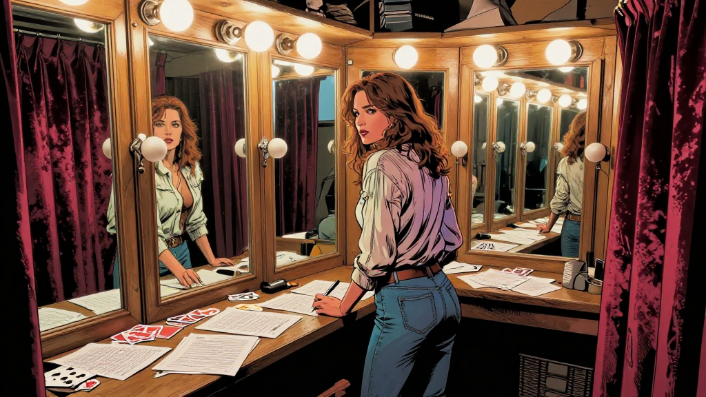 Marcus Webb's cramped dressing room—mirrored walls reflect velvet curtains and scattered playing cards. Eleanor Vance stands by Marcus's makeup table, papers spread across the cluttered surface, fountain pen in hand.