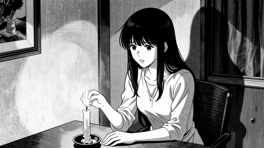 Elena in her hotel room, candle flickering as shadows shift unnaturally.