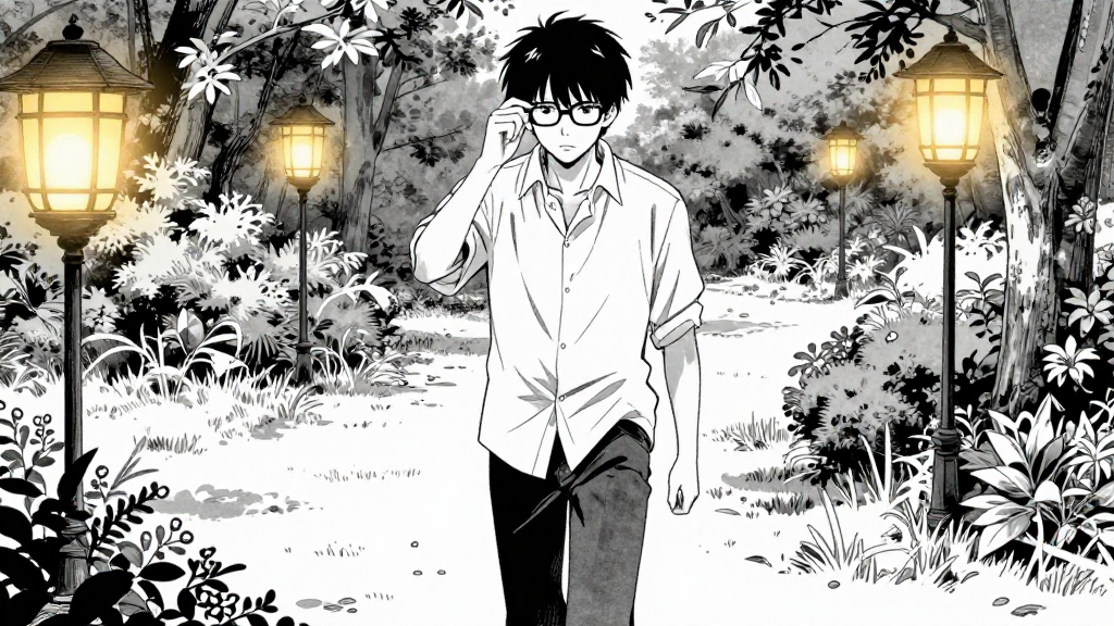 Kenjiro walks into the garden, adjusting his glasses, heart heavy.
