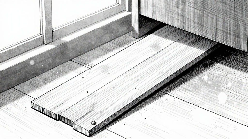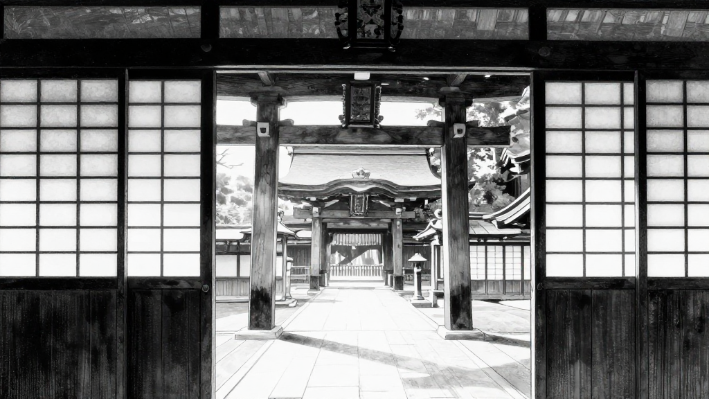 Wide shot of the shrine in early morning, sunlight filtering through paper screens.