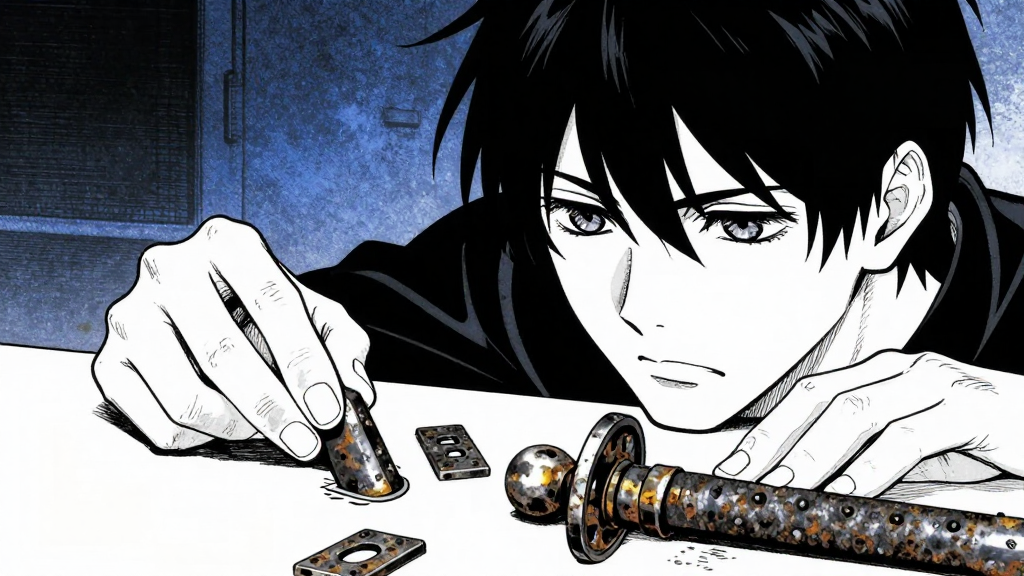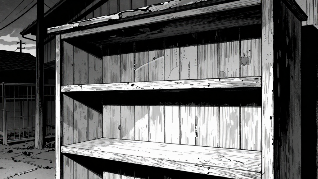 Predawn darkness in the Nakamura tenement. Cracked ancestor shelf dominates the frame.
