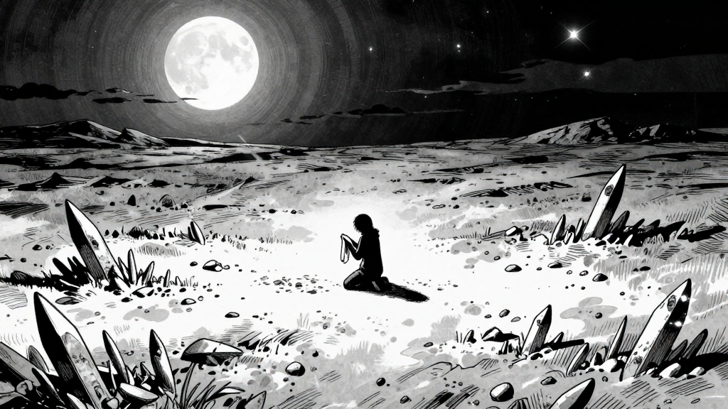 A vast, moonlit expanse of the Borderlands. Obsidian shards glint like fallen stars. A lone figure kneels in the center, a memory-cloth in hand.