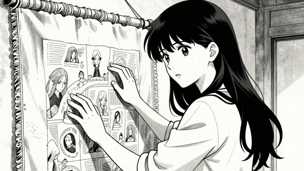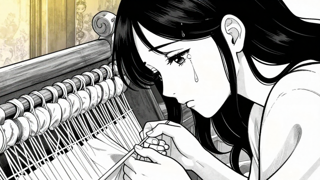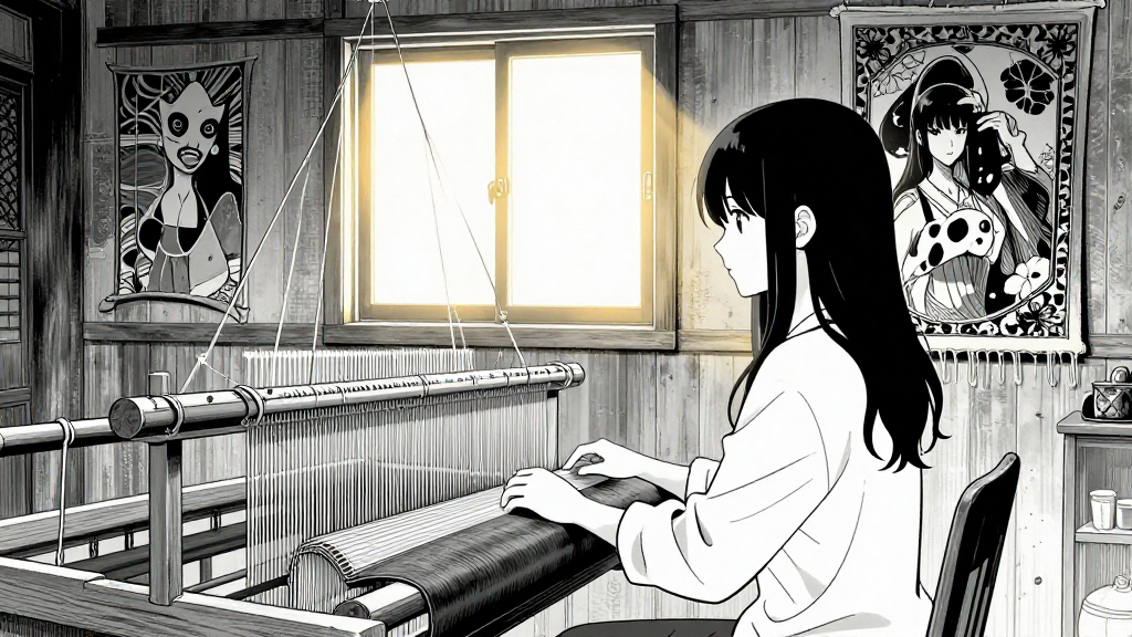 Soft light filters through a single window in Elara's Loft, illuminating the loom and half-finished tapestries.