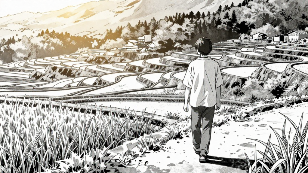 Kenji walks into Cedar Valley, rice terraces glowing under sunlight.