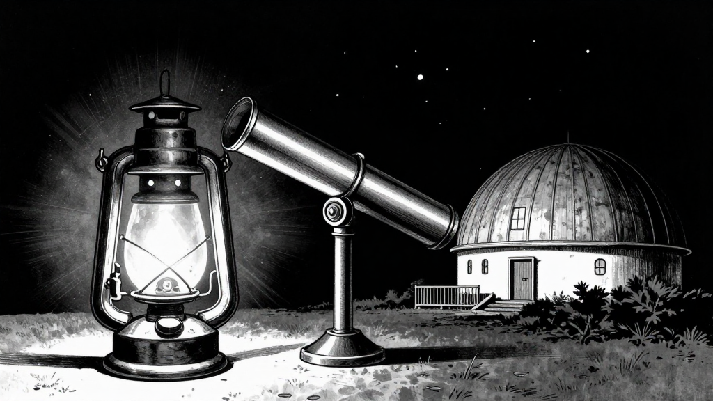 The von Sternberg Observatory at midnight. Brass telescope glows under oil lamp. Dust motes swirl in shafts of light.